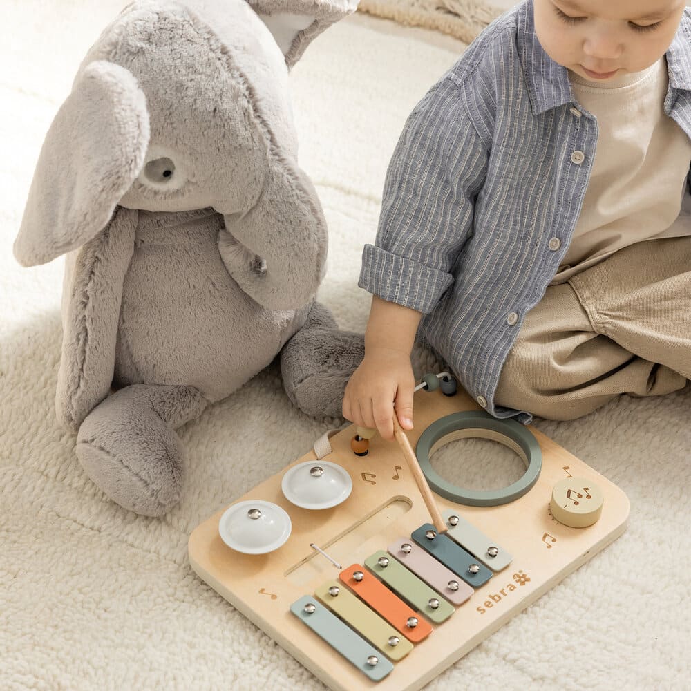 Свирете мелодии на ксилофона, бийте барабана и чинелите, регулирайте силата на звука с въртящото се копче и поддържайте ритъма, като движите цветните дървени мъниста по стоманената тел.